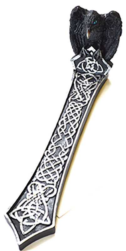 A cold cast resin stick incense burner featuring a Celtic knot design along the base, with a raven perched at one end. A mystical blend of symbolism and style, perfect for adding a touch of magic to your space while burning your favorite incense.