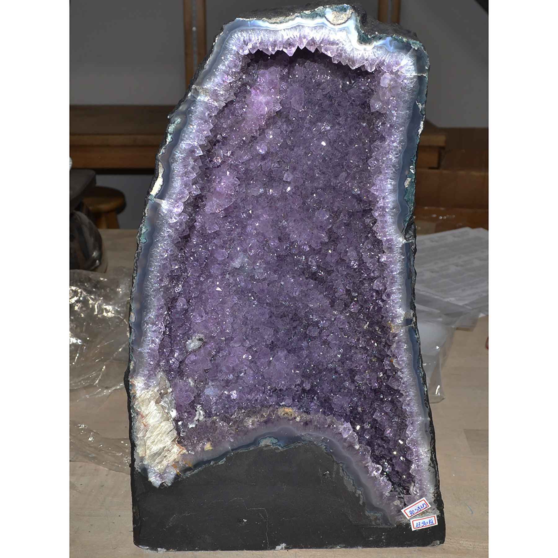 Stunning 30-pound Amethyst Cathedral. Standing approximately 14½" tall with an 8" wide base, its wide, deep opening reveals a sparkling interior that catches the light from every angle. Perfect as a striking centerpiece, this cathedral radiates calming energy while showcasing the natural beauty and brilliance of amethyst.