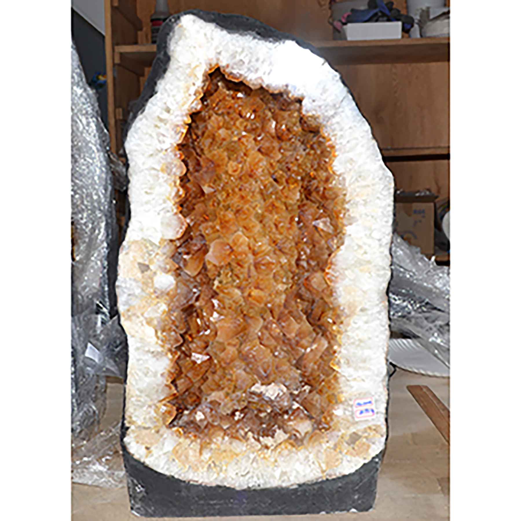 56-pound Citrine Cathedral with a bold, commanding presence. Its thick frame reveals a deep, glowing interior filled with sparkling golden crystals that catch the light from every angle. Standing approximately 18" tall, this cathedral makes a stunning centerpiece while radiating uplifting, energizing vibes, perfect for display, meditation, or enhancing the energy of any space.