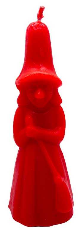 Red Witch candle, proudly standing with pumpkin in hand. Embedded wick runs full length of candle. 8" sizes may vary. From India