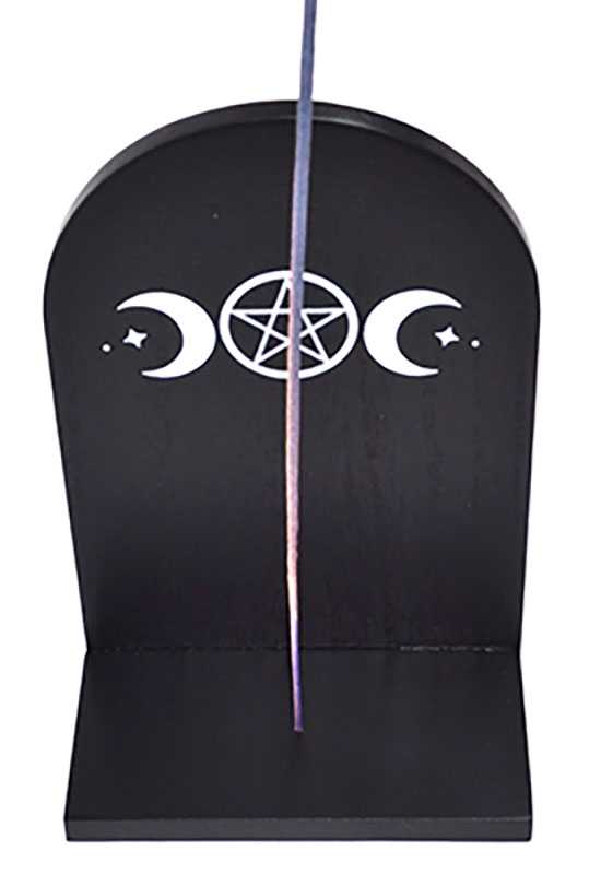 This solid black incense burner can be displayed on a wall or placed on any surface to suit your space. The front features a bold triple moon pentagram design, symbolizing protection, intuition, and spiritual balance. Crafted for both function and style, it holds stick incense securely while adding a touch of mystical energy to your altar, meditation space, or home decor. Incense not included