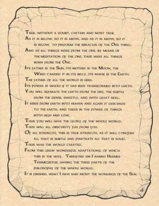 This wonderful parchment poster is an interpretation of the fabled Emerald Tablet put, a text said to offer the secrets of the primordial substance and its transformations. 8 1/2" x 11".