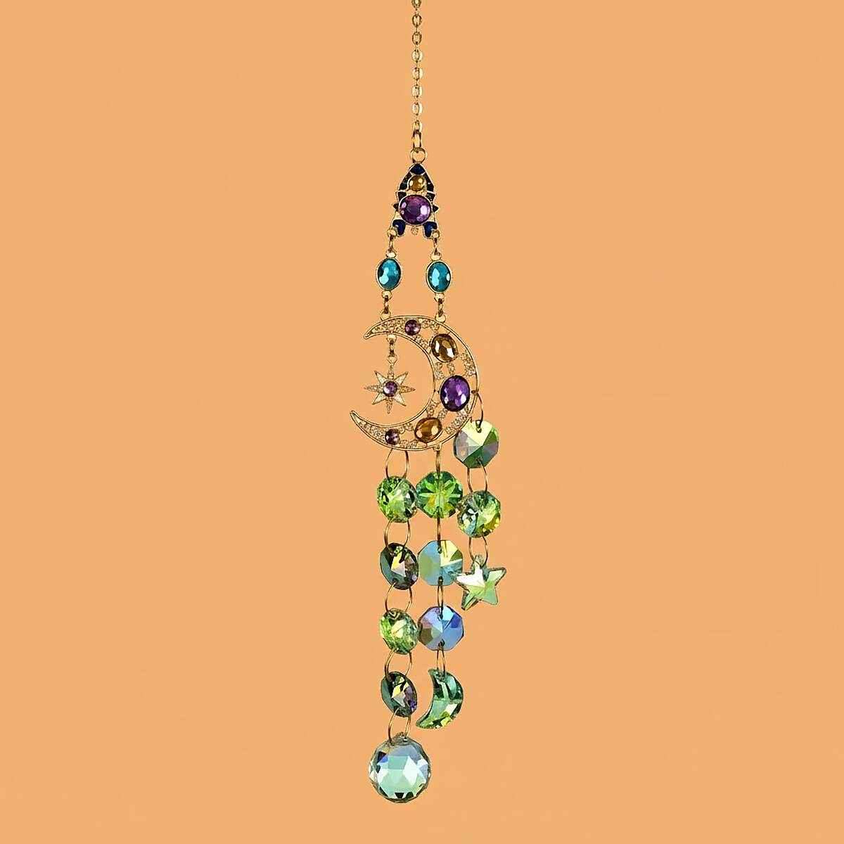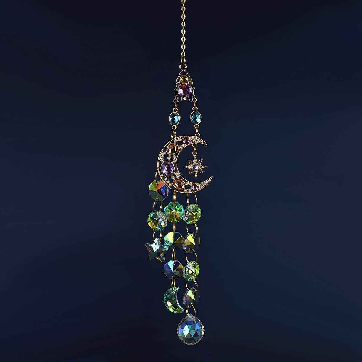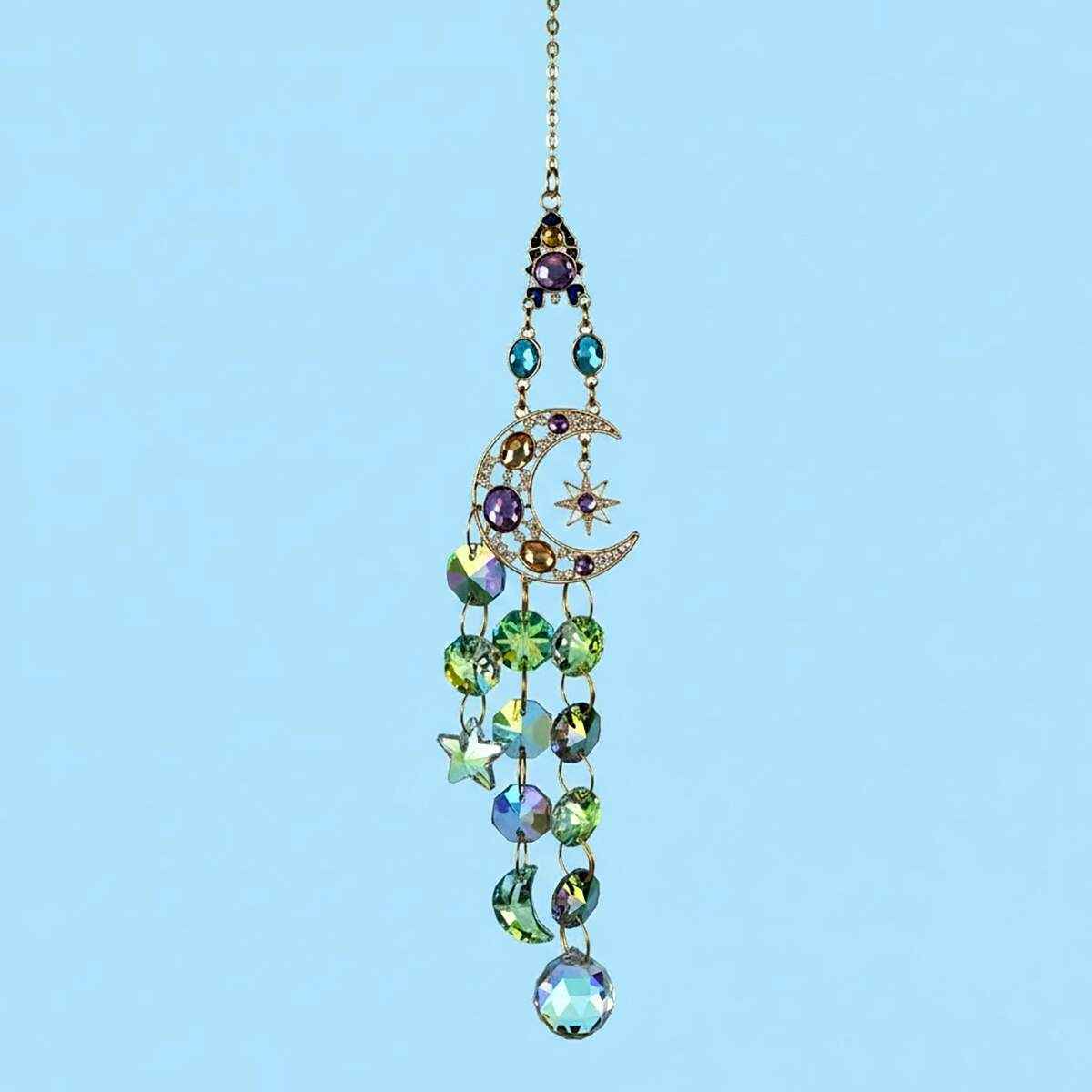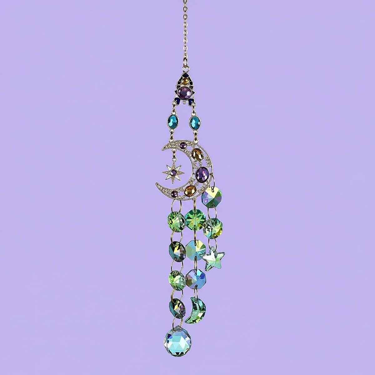 This Large Celestial Suncatcher is ready to hang for display and measures 16.5 inches long. It holds a large crescent moon that cradles a star. And glass-cut crystals in round, moon, and star shapes fall in a bright cascade from the center. A large teardrop crystal hangs at the base. Place it in a sunny window, because direct light will break into clean color across nearby surfaces.