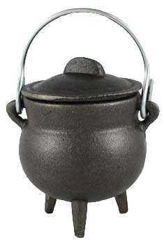 Crafted of cast iron and standing on three small legs this cauldron comes a small handle on either side and a carrying handle. Made in a two-part casting process; seams may be visible and rough on some cauldrons. 3" x 2 3/4"